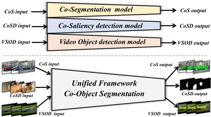 BJECT segmentation [1], [2], [3] and detection [4], [5] are the core tasks in computer vision. In our real world, the continuous emergence of massive group-based data and dynamic multi-frame data make deep learning more in the direction of human vision. As a result, more and more studies focus on co-segmentation (CoS) [6], [7], co-saliency detection (CoSD) [8], [9] and video salient object detection (VSOD) [10], [11]. Among them, these tasks all share the common objects with the same attributes given a group of relevant images or within several adjacent frames in the video. They all essentially aim to discover and segment the co-occurrent object by imitating the human vision system.