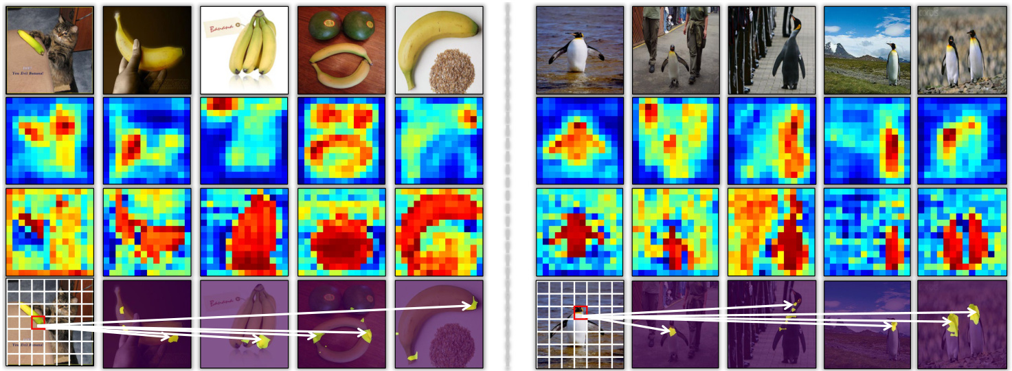它学到了什么?图4展示了Transformer模块学习到的内容(输出来自$F_{3}^{\prime}$)。如第3行所示,经过Transformer模块处理后,共现物体区域对应的图像块激活程度显著高于第2行,这表明Transformer投影函数中的注意力机制能自适应关注目标区域,并为捕捉全局线索分配更高权重。此外,我们还可视化选定图像块(即"香蕉"末端和企鹅"头部")的查询注意力,展示其匹配对象。第3行的定性可视化进一步验证了Transformer模块能帮助网络建模不同位置像素间的长程依赖关系。
