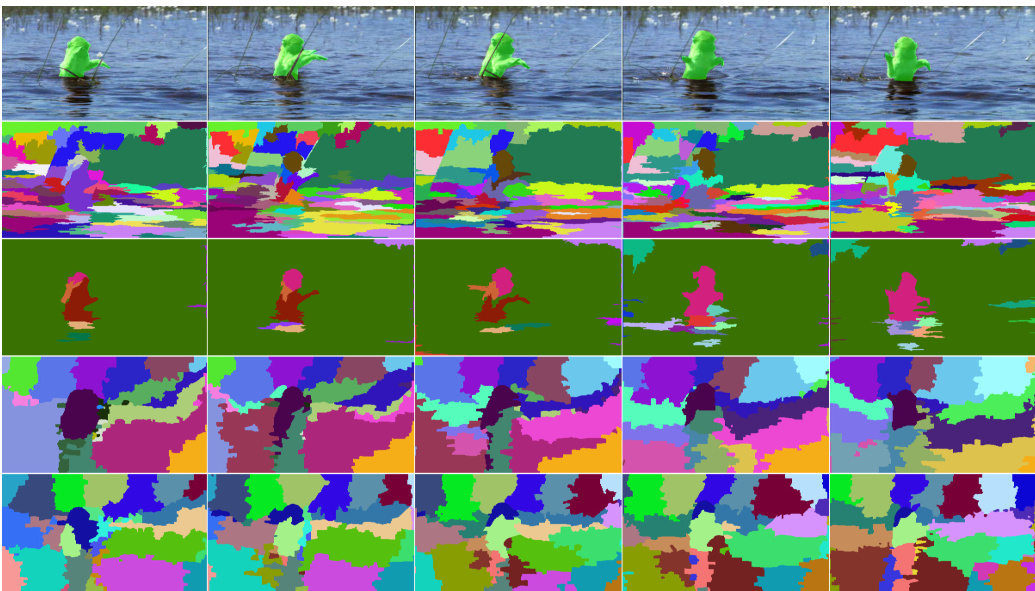 图 1: Segtrack v2数据集[6]中视频"monkey"的分割结果。首行: 叠加真实标注(绿色)的原始帧。第二行: 使用四种预定义特征的PGP算法([7])分割结果。第三行: 整合我们特征的PGP算法结果。第四行: 采用文献[8]提出的6个特征的谱聚类分割结果。末行: 整合我们特征的谱聚类分割结果。我们的方法展现出更好的时间一致性和更少的过分割现象。