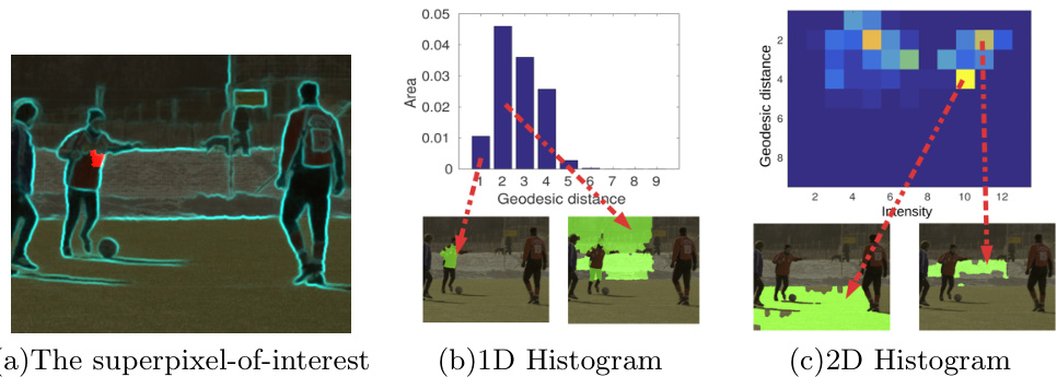 Fig. 2(c) visualizes the intensity-geodesic distance histogram of a superpixelof-interest (shown in red in Fig. 2(a)). Notice that the second bin of the 1D histogram equals to the sum of all cells in the second row of the 2D histogram, and the region from the second bin in the 1D histogram is now separated into multiple smaller regions corresponding to these cells. This is a desired effect given that each of the cells in the 2D histogram contains super pixels from the same semantic region as the 1D case. We also visualized the cell with the highest value in Fig. 2(c), which corresponds to the super pixels within the entire grass field. Such a region is likely to be stable across frames and remain connected. This implies that as long as the intermediate boundaries remain the same, these regions would still contribute to the same cells in the histogram.