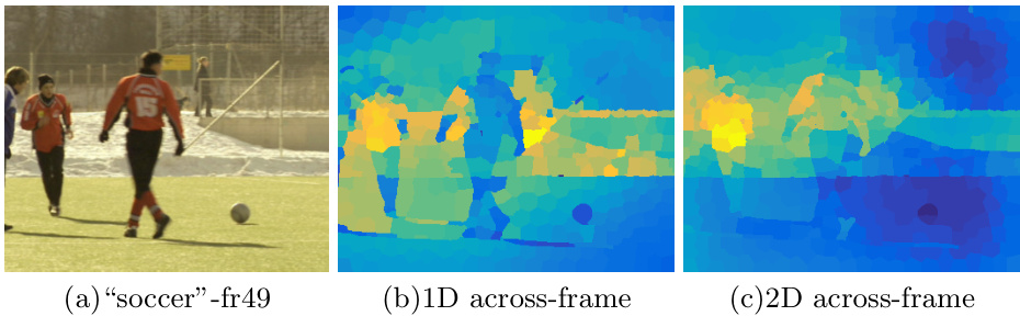 Fig. 3 visualizes the similarity values computed based on 1D and 2D feature histograms from the superpixel-of-interest in Fig. 2(a) on a later video frame. In the color scheme, higher similarity is represented by the warmer color. The figure shows that the 1D histogram is less robust than the 2D histogram: there are multiple regions having similar 1D histograms with the superpixel-of-interest, and the superpixel with the highest 1D histogram similarity is in the background. In contrast, the superpixel with the highest similarity using the 2D histogram falls within the same upper-body region, a desirable result.