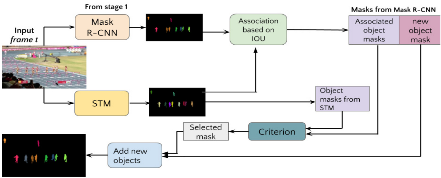 Figure 1: Block diagram of stage 2 of our algorithm. Here criterion can be either criterion $I$ or criterion 2. Given an input frame, two sets of mask are generated using Mask R-CNN and STM. It is followed by mask association and identifying new objects detected by Mask R-CNN. The associated pairs are sent to the criterion and best mask is selected to be propagated further. The same pipeline is followed for the two independent criteria proposed in this work. The only difference is that for one pipeline criterion $I$ is used and for second pipeline criterion 2 is used.