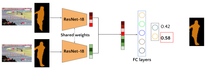 图 2: Selector Net架构:两对输入分别是原始RGB图像及对应的Mask RCNN物体掩膜,以及原始RGB图像及STM传播的掩膜。它们被送入具有共享权重的特征提取模块。提取的特征随后被拼接并输入网络以输出掩膜分数。分数较高的掩膜被视为更优掩膜并向前传播。