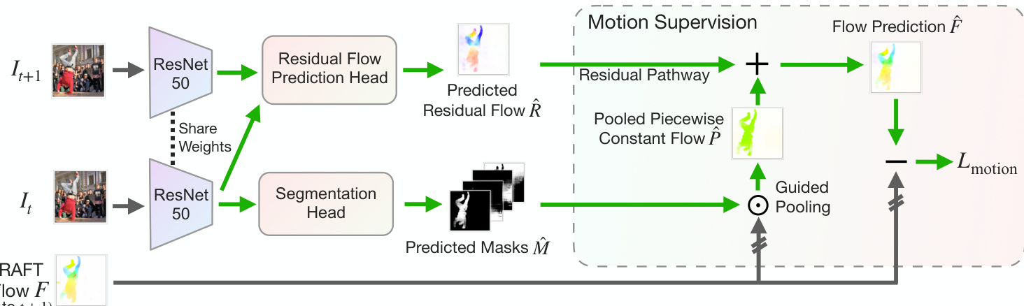 Figure 3. Our object discovery stage uses motion as supervision and follows the principle of relaxed common fate, in which training signals are obtained by reconstructing the reference RAFT flow with the sum from the two pathways: 1) a piecewise constant flow pathway, which is created from pooling the RAFT flow with the predicted masks in order to model object-level motion; 2) a predicted pixel-wise residual flow pathway, which models intra-object motion for articulated and deformable objects. Green arrows indicate gradient backprop.