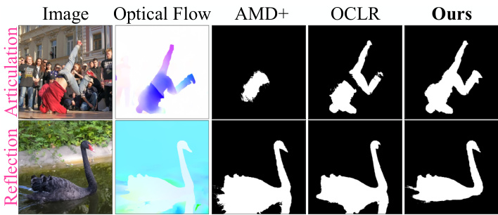 - Reflection: Shadows or reflections of an object always move with the object but are not part of the object; common fate thus leads to excessive objectness that covers more than the object. In Fig.1 bottom, $\mathrm{AMD+}$ or OCLR cannot separate the swan from its reflection in water.