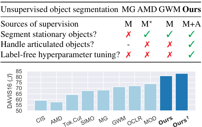 Figure 2. Advantages over leading unsupervised object segmentation methods MG [47]/AMD [23]/GWM [6]: 1) With motion supervision instead of motion input, we can segment stationary objects. 2) With both motion (M) and appearance (A) as supervision, we can discover full objectness from noisy motion cues.  $\mathbf{M}^{*}$  refers to implicit motion via image warping. 3) By modeling relative motion within an object, we can handle articulated objects. 4) By comparing motion-based segmentation with appearance-based segmentation, we can tune hyper parameters without labels. Our performance gain is substantial, more with post-processing (†).