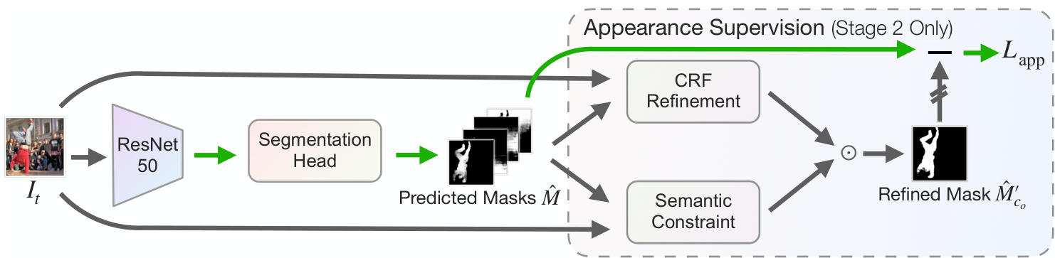Appearance supervision with low-level intra-image cues. With the model in stage 1, we obtain the mask prediction $\hat{M}{c_{o}}$ of $I_{t}$ , where $c_{o}$ is the objectness channel that could be found without annotation (Sec. 3.4). We then apply fullyconnected conditional random field (CRF) [18], a trainingfree technique that refines the value of each prediction based on other pixels with an appearance and a smoothness kernel. The refined masks $\hat{M}{c{o}}^{\prime}$ are then used as supervision to provide appearance signals in training: