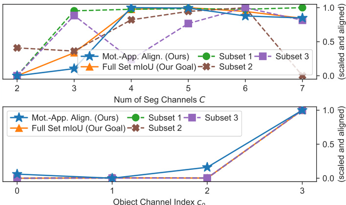 我们使用运动-外观对齐作为指标来调整两个关键超参数:分割掩码数量 $C$ 和物体通道索引 $c_{o}$。为了模拟现实场景中仅有有限标注验证数据的情况,我们还随机采样 $25%$ 序列三次,创建验证集的三个标注子集用于评估 mIoU。如图 6 所示,对于掩码通道数量 $C$,尽管未使用任何人工标注,我们的无标签运动-外观对齐指标与验证子集上的 mIoU 高度一致,证明了该指标在超参数调优中的有效性。虽然增加通道数量能通过提升模型拟合能力来改善分割质量,但这种提升