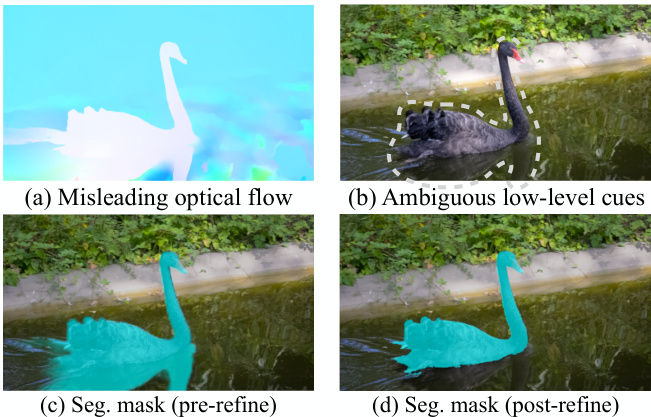 Appearance supervision with semantic constraint. Lowlevel appearance is still insufficient to address misleading motion signals from naturally occurring con founders with similar motion patterns. For example, the reflections share similar motion as the swan in Fig. 5, which is confirmed by low-level appearance. However, humans could recognize that the swan and the reflection have distinct semantics, with the reflection’s semantics much closer to the background.