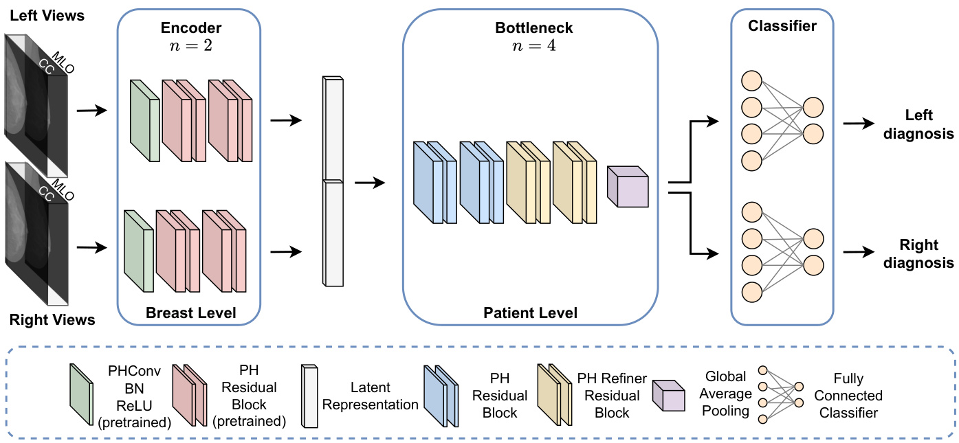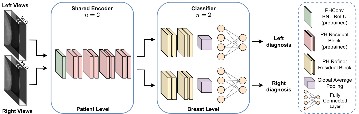 图 5: PHYBOnet架构。该模型首先通过输入两对同侧视图进行乳腺级别分析,这些视图由两个预训练的PH编码器分支处理($n=2$)。学习到的潜在表征随后通过四个PH残差块($n=4$)以联合方式处理。最后,两个分支的输出在经过全局平均池化操作后,分别馈入独立的最终全连接层。