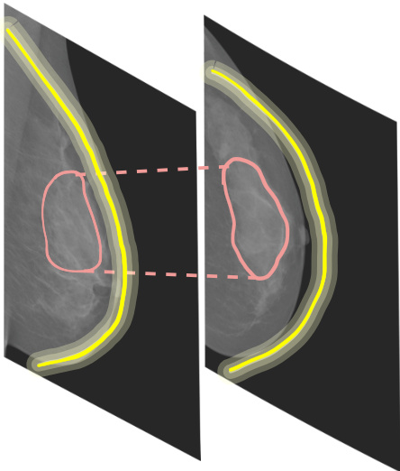Fig. 3. Global and local relations. Global relations are intra-view features, e.g., the shape of the breast (depicted in shades of yellow). Local relations are inter-view features, e.g., textures (depicted in red).