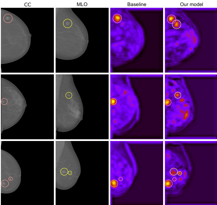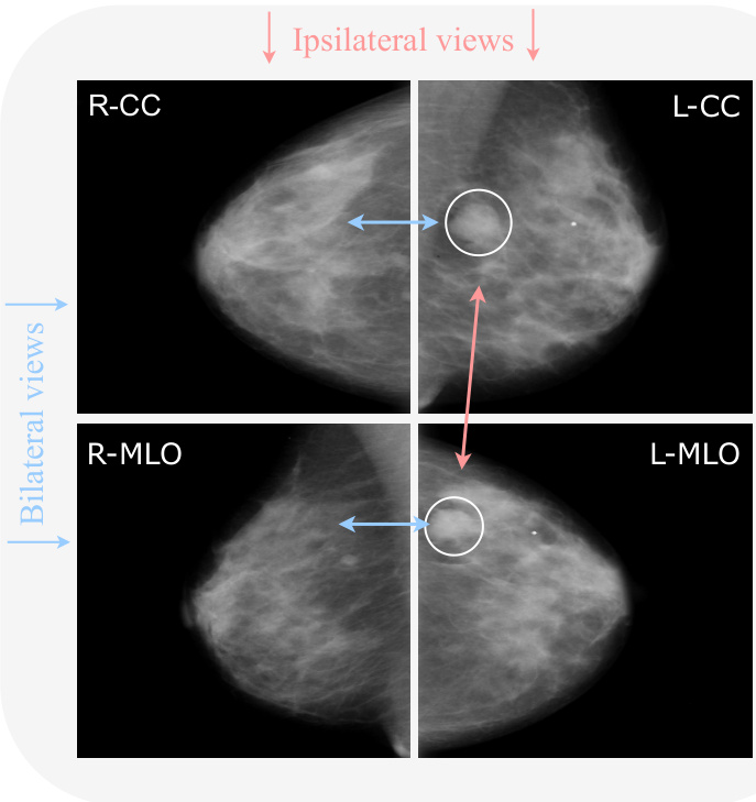 乳腺X光检查会拍摄乳房的两种视图:从上向下拍摄的头尾位 (CC) 视图,以及从侧面拍摄的内外侧斜位 (MLO) 视图。具体而言,同一乳房的CC和MLO视图称为同侧视图,而双侧乳房的相同视图则称为双侧视图。值得注意的是,放射科医生在解读乳腺X光片时,会通过双重对比进行分析——既比较同侧视图,又比较双侧视图,因为每种对比都能提供有价值的信息。研究发现,这种多视图分析对于准确诊断乳腺癌至关重要 [4][5]。