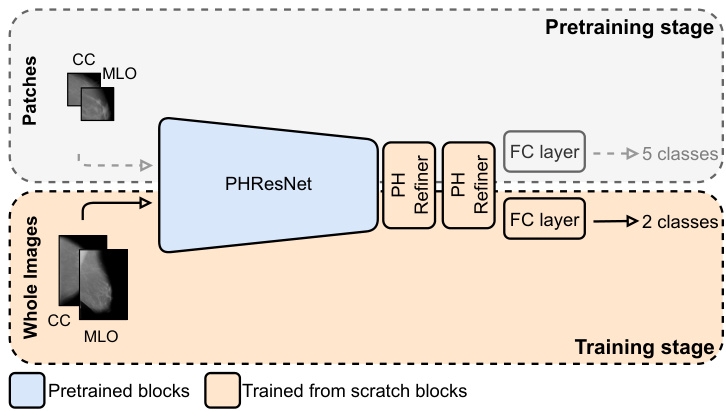 Fig. 4. Training pipeline and PHResNet overview. We employ a pertaining stage to overcome issues presented in Section efsubsec:training. During this stage, the PHResNet is trained on patches extracted from the original mammogram. They are classified into five classes: background or normal, benign and malignant calcification s and masses, respectively. At downstream time, i.e., when training on whole images, two PH convolutional refiner blocks are added and trained from scratch together with the final classification layer.