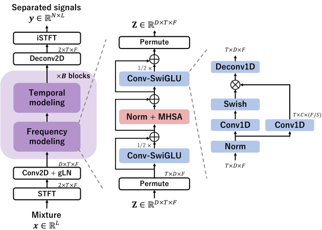 where MHSA stands for multi-head self-attention [9]. MHSA has $H$ heads and each head processes $D/H$ -dimensional feature. We use rotary positional encoding [21] for encoding the relative position of each frequency bin. The ConvSwiGLU module and the Norm layer will be described in Sections 2.2 and 2.3, respectively. Temporal modeling is done in the same way by viewing the feature $\boldsymbol{z}$ as a stack of $F$ arrays of shape $D\times T$ , where $T$ is the sequence length (i.e., we permute the dimension order of $\boldsymbol{z}$ to $F\times D\times T)$ . After alternating between frequency and temporal modeling $B$ times, the final feature $\boldsymbol{z}$ is used to estimate the RI components of $N$ sources: