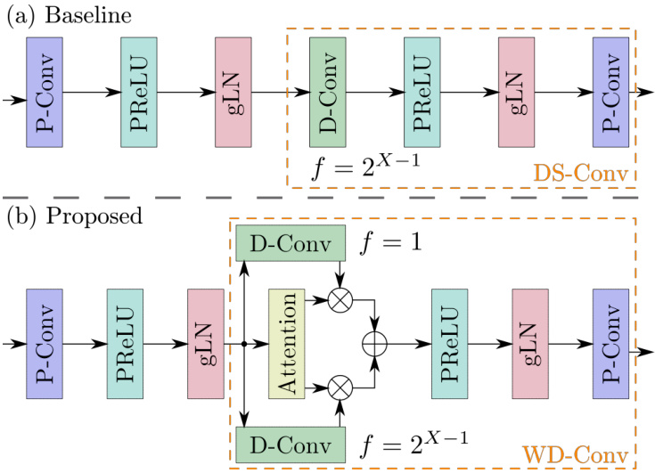 Fig. 1: (a) Convolutional block in baseline TCN; (b) Proposed convolutional block. Example for final block in a stack of conv. blocks for $Q:=:2$ with dilation factor $f=2^{X-1}$ . Note that a residual connection around the entire block is omitted for brevity.