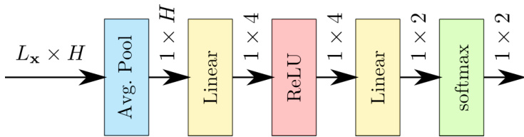 Inspired by the dynamic convolution kernel proposed in [21], the implementation proposed in this paper computes the weights for each D-Conv layer using an squeeze-and-excite (SE) attention network [26]. The SE attention network is shown in Fig. 2 and is composed of a global average pooling layer that reduces the sequence dimension from $L_{\mathbf{x}}$ to 1 producing a vector of dimension $H$ , the same as the feature dimension of the input. This feature vector is then compressed using a linear layer, with a rectified linear unit (ReLU) activation, to a dimension of 4 as in [21]. The final stage is a linear layer that computes a weight for each of the D-Conv kernels in the WD-Conv structure. In the proposed model there are two D-Conv kernels and so the linear layer has an input dimension of 4 and an output dimension of 2. A softmax activation is used to ensure the sum-to-one constraint on the weights of the D-Conv layers.