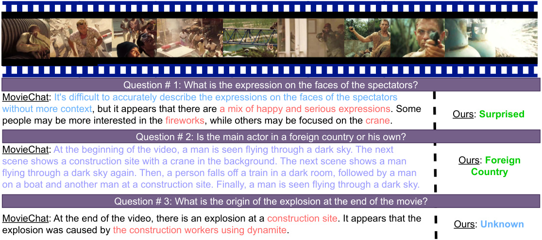 Figure 6: Qualitative Results: We select a challenging video from the MovieChat-1k dataset and pose various difficult questions to both MovieChat (Song et al., 2024) and HERMES. The results demonstrate our model’s superior ability to answer both fine-grained questions (Q1 and Q3) and general questions (Q2). Answers highlighted in blue denote tentative answers, red denote wrong answers, purple denote hallucinations, and green denote correct answers.