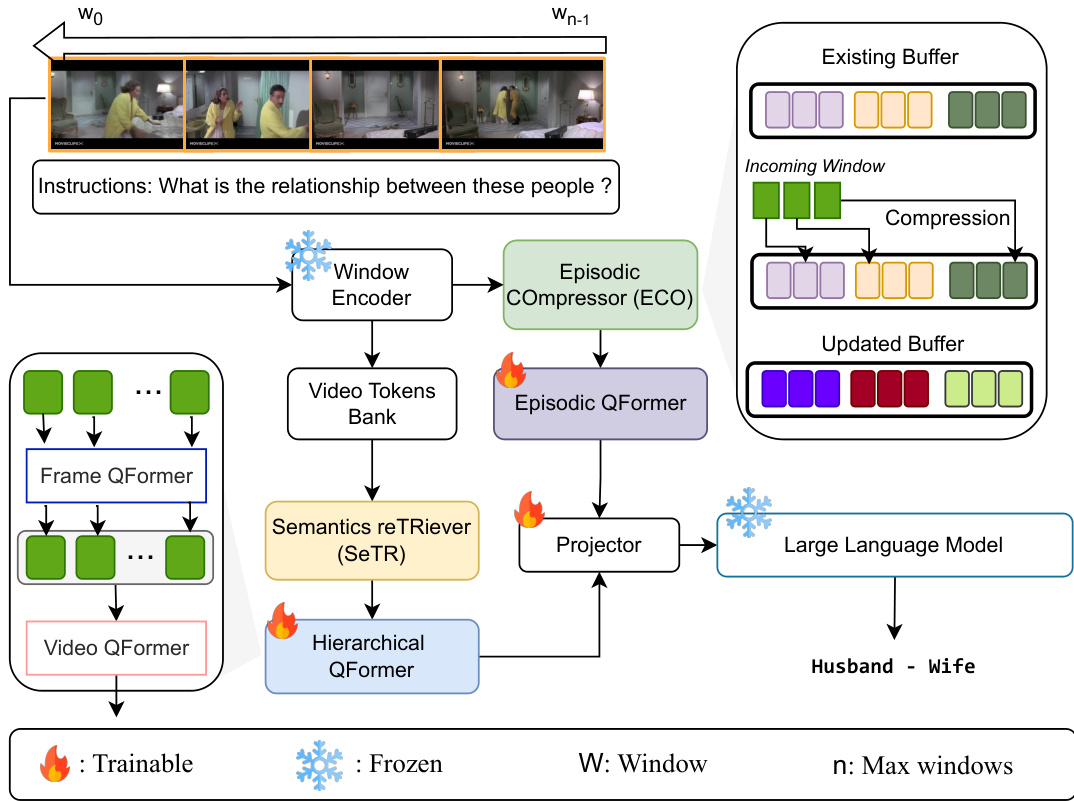 Figure 2: HERMES framework overview: We stream through a video window-by-window and extract features using a frozen ViT. Each window feature is processed by the Episodic COmpressor (ECO) in an online fashion, discarding redundancies along the way and retaining video episodes that are passed to an episodic Q-Former. The video token bank contains the concatenated features of every window, and SeTR selects only the high-level information to pass to a hierarchical frame-tosequence Q-Former. The episodic and high-level representations are then concatenated before being fed to the frozen LLM, which outputs a text following the instructions.