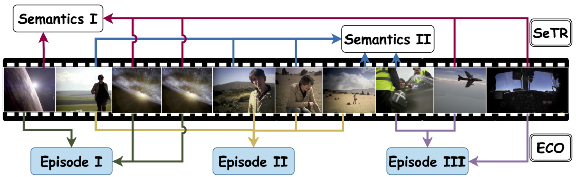 给定一段视频(无论长短)和一组指定如何处理该视频的指令,我们的方法能够返回指定的输出结果,例如视频问答(VQA)或视频分类。该方法通过利用人类理解场景的两个重要特性来实现:情景记忆(episodic memory)涉及确定并分层处理具有相似属性的帧序列;语义知识(semantic knowledge)则有助于回答关于场景的广泛问题(例如该场景发生在夜间还是白天?)。我们将前者称为ECO(详见第3.2节),后者称为SeTR(详见第3.4节)。