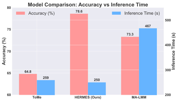 How effective and efficient is ECO compared to other memory compressors? To demonstrate the effectiveness and efficiency of our proposed ECO, we conduct a comparative analysis against two strong existing compression techniques: ToMe (Bolya et al., 2022) and MALMM (He et al., 2024) in Figure 5. We calculate the inference time for each model on the MovieChat-1k dataset. Powered by ECO our model achieves the highest accuracy $(78.6%)$ among all models, outperforming MA-LMM by $5.3%$ and ToMe by a substantial $13.8%$ . HERMES achieves the highest inference speed among the compared models, while also maintaining superior accuracy. It is slightly faster than ToMe and significantly outperforms MALMM, reducing inference time by $46%$ com