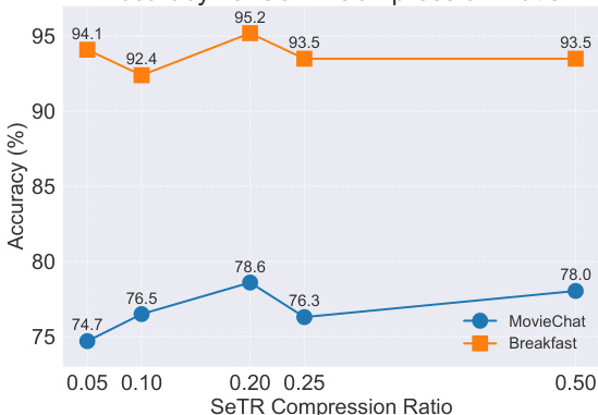 Figure 4: Effect of the SeTR ’s keep ratio on the model’s accuracy on the MovieChat-1k and Breakfast datasets.