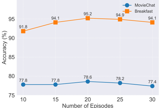 Figure 3: Effect of the number of ECO episodes on the model’s accuracy on the MovieChat-1k and Breakfast datasets.