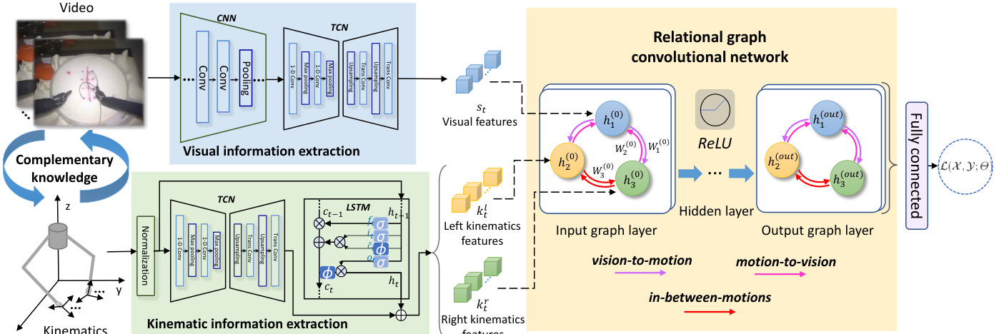 Fig. 1. The overview of our proposed multi-modal relational graph network for surgical gesture recognition in robot-assisted surgery.