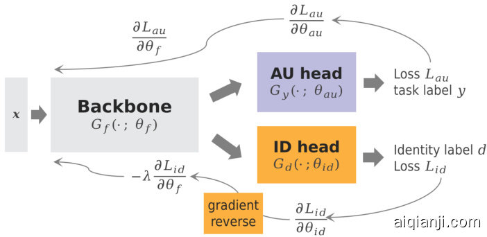 我们在本文中的一个关键发现是,AU (Action Unit) 数据集中的受试者数量有限,使得身份识别成为一项简单任务,并提供了捷径学习路径,从而导致AU模型包含与身份相关的特征且泛化能力不佳 (见第5节)。受领域自适应中梯度反转 [20] 的启发,我们提出在AU检测中应用梯度反转来学习身份不变特征,以提升模型的泛化能力。