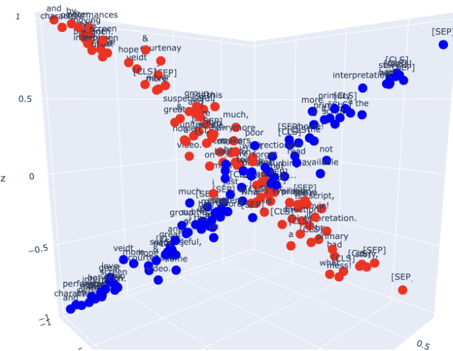 As a good side-effect of the tanh we add additional nonlinearity and squashing effect to the model. Thus, no additional normalization of values is required. Besides, we shrink our problem to the compact (hypercube with side 2, from -1 to 1). In Figure 1, one can find a benefit from such an approach. We can now easily interpret the outcome of the binary classification model. The visualization provided is the contextual embedding of the BERT model into 3- dimensional context attribution space for the IMDB classification task (this is done for test examples, so the model is not overfitted, and what we clearly see is the orthogonality of the negative and positive sentiment concepts).