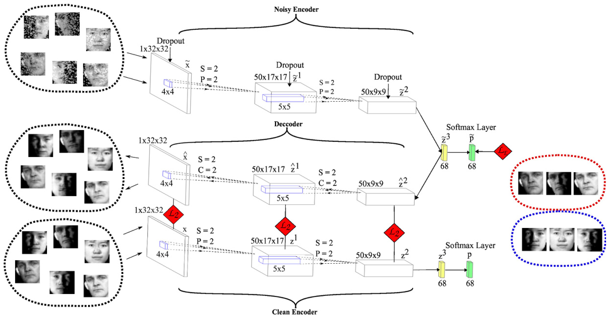 Figure 2: Architecture of DEPICT for CMU-PIE dataset. DEPICT consists of a soft-max layer stacked on top of a multilayer convolutional auto encoder. In order to illustrate the joint learning framework, we consider the following four pathways for DEPICT: Noisy (corrupted) encoder, Decoder, Clean encoder and Soft-max layer. The clustering loss function, $L_{E}$ , is applied on the noisy pathway, and the reconstruction loss functions, $L_{2}$ , are between the decoder and clean encoder layers. The output size of convolutional layers, kernel sizes, strides (S), paddings (P) and crops (C) are also shown.