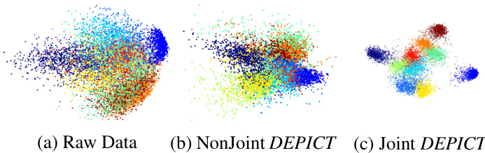 Figure 1 demonstrates the importance of our joint learning strategy by comparing different data representations of MNIST-test data points [17] using principle component analysis (PCA) visualization. The first figure indicates the raw data representation; The second one shows the data points in the embedding subspace of non-joint DEPICT, in which the model is trained using the standard layer-wise stacked denoising auto encoder (SdA); The third one visualizes the data points in the embedding subspace of joint DEPICT, in which the model is trained using our multilayer denoising auto encoder learning approach (MdA). As shown, joint DEPICT using MdA learning approach provides a significantly more disc rim i native embedding subspace compared to non-joint DEPICT using standard SdA learning approach.