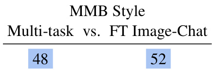 我们发现评分者选择MMB Style和2AMMC模型回复的频率显著高于Dodeca (表10)。同时,与仅在Image-Chat数据集微调(未在对话数据集微调)的同模型相比,MMB Style的图像回复被选择率未出现显著差异 (表11),这表明对话数据集的多任务训练不会削弱模型对图像的有效响应能力。