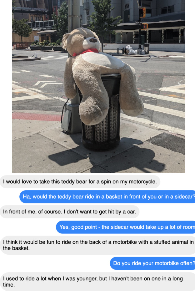 Figure 1: Paper author (right speaker) conversing with our MMB DegenPos model (left speaker). This example was cherry picked. We show more sample conversations in Section 6.2.