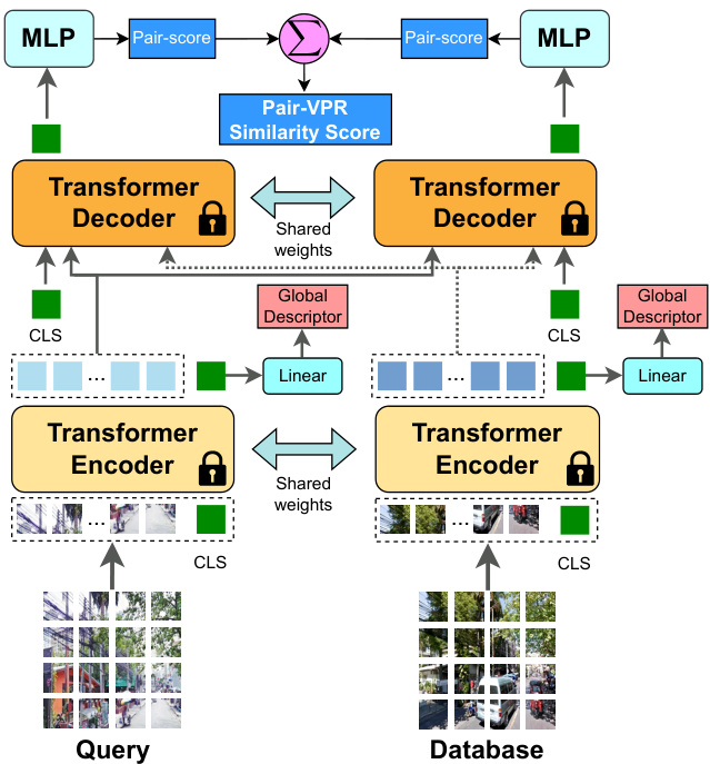 In the second stage, we re-use both the encoder and decoder, by jointly learning to produce a global descriptor from the encoder and using the decoder as a pair classification network. The pair classifier produces a similarity score denoting whether a given pair of images were captured from the same location, or not. A diagram showing our network architecture and training recipe is shown in Figure 1. The Pair-VPR network uses a vision transformer setup, with ViT blocks in both the encoder and decoder. We leverage the class token output to supervise the network, with a low-dimensional global descriptor produced from an encoder class token and a pair similarity score from decoder class tokens. The network is then trained using a Multi-Similarity loss for the global descriptor and a Binary Cross-Entropy loss for the pair classifier, with online triplet mining. We benchmark the trained network on existing VPR benchmark datasets and observe state-of-the-art Recall $@1$ on all tested datasets with a ViT-B encoder, such as an improvement in the Recall $@1$ on the Tokyo24/7 dataset from $95%$ to $98%$ . Moreover, we show that our proposed method can be extended to much larger vision transformer encoders (ViT-L, ViT-G) and achieve a new benchmark result of Recall $@1$ on Tokyo24/7 of $100%$ with our best performing configuration.