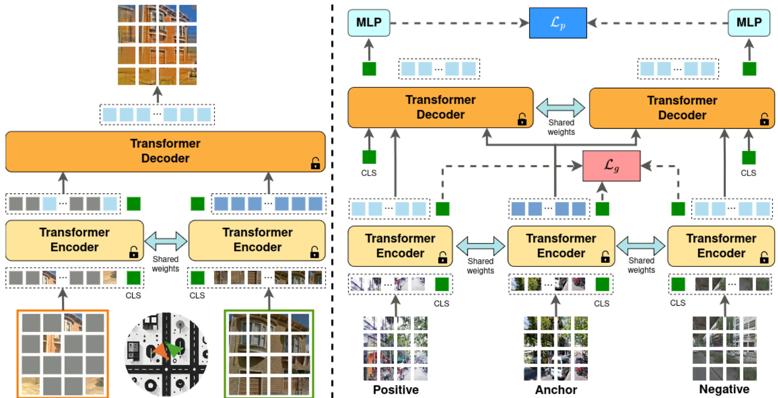 在第一阶段,我们向网络提供图像对,并对其中一张图像进行重度掩码处理。训练目标是通过具备编码器和解码器组件的网络重构被掩码图像。在第二阶段,我们联合优化编码器和解码器以用于视觉位置识别 (VPR),从编码器的类别 token 生成全局描述符,同时训练解码器预测给定图像对是正样本对还是负样本对。