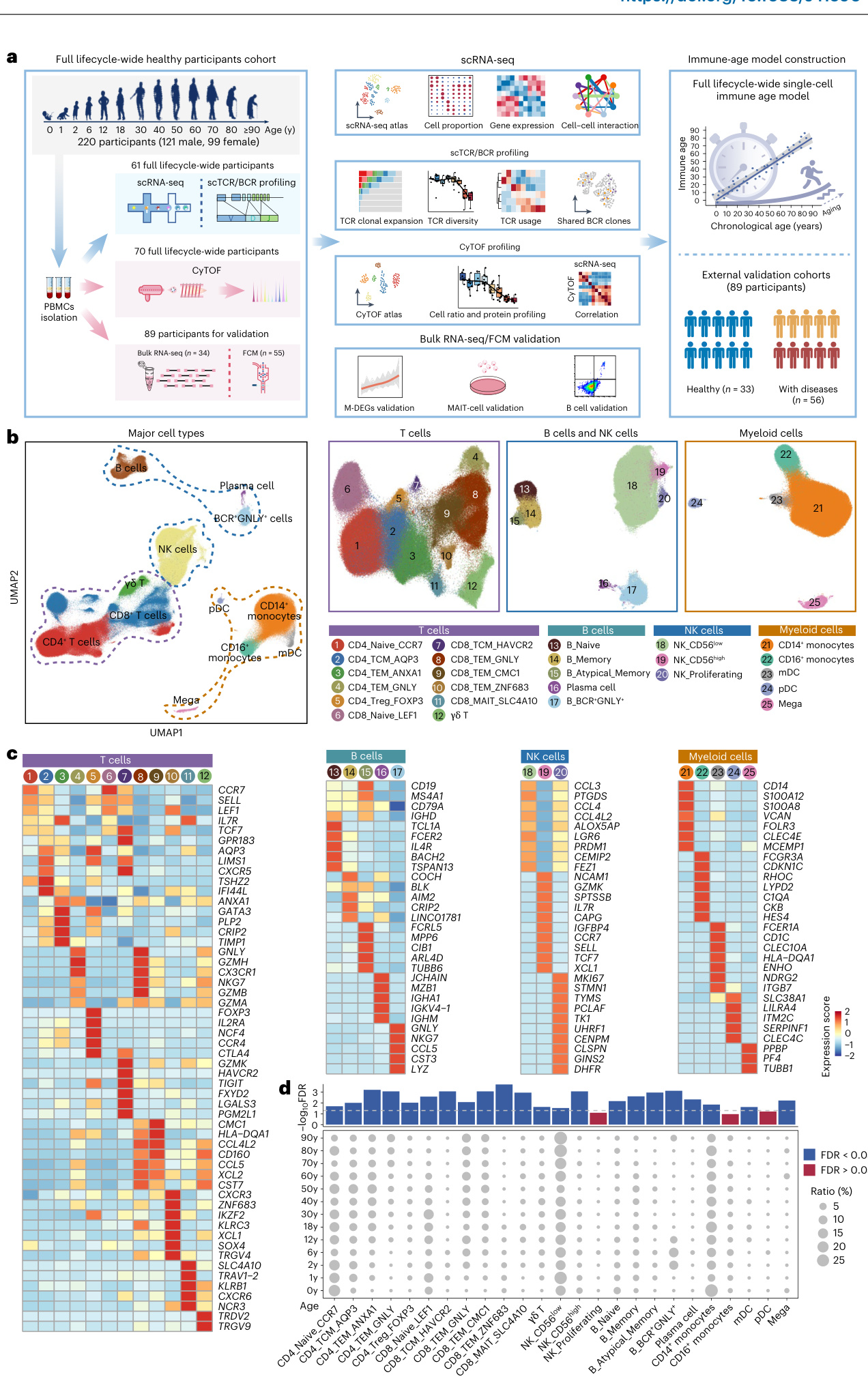 All human samples were obtained in accordance with protocols approved by the Institutional Review Board at Shanghai Jiao Tong University.All donors were enrolled with approval by the Ethics Committee of RenJi Hospital (KY2019-136),School of Medicine, Shanghai Jiao Tong University. After providing written informed consent in accordance with the criteria set by the Declaration of Helsinki (2013)68, 220 healthy volunteers agedOto ${\ge}90$ years were recruited from Shanghai Pudong Cohort (NC T 05206643), including 61 healthy participants aged 0 to $\scriptstyle\geq90$ years for scRNA and scTCR/scBCR sequencing; 7O healthy partic i pants age dO to $\scriptstyle\geq90$ years for independent CyTOF-based single-cell protein validation experiments; 34 healthy participants aged 0 to ${\ge}90$ years for independent bulk RNA-seq validation experiments; and 55 healthy participants aged 2-72 yearsfor validation experiments. The inclusion and exclusion criteria for participants in this study is provided in Supplementary Information Section 3. The participants spanned the entire lifespan, partitioned into 13 age groups (0-,1-,2-,6-,12-,18-,30-, 40-,50-,60-,70-,80-and over 90-year-olds). Toyield more biologically meaningful results, when performing statistical testing to determine the differences among groups,participants were categorized into eight life stages as suggested by developmental biologists 22-24 as follows: O years old, newborn (umbilical cord blood); 1-2 years old, toddler; 6-8 years old, childhood; 12-18 years old, adolescent; 30-40 years old, young adult, 50-60 years old, middle-aged adult; 70-80 years old, elderly; and over 90 years old, elderly-plus.