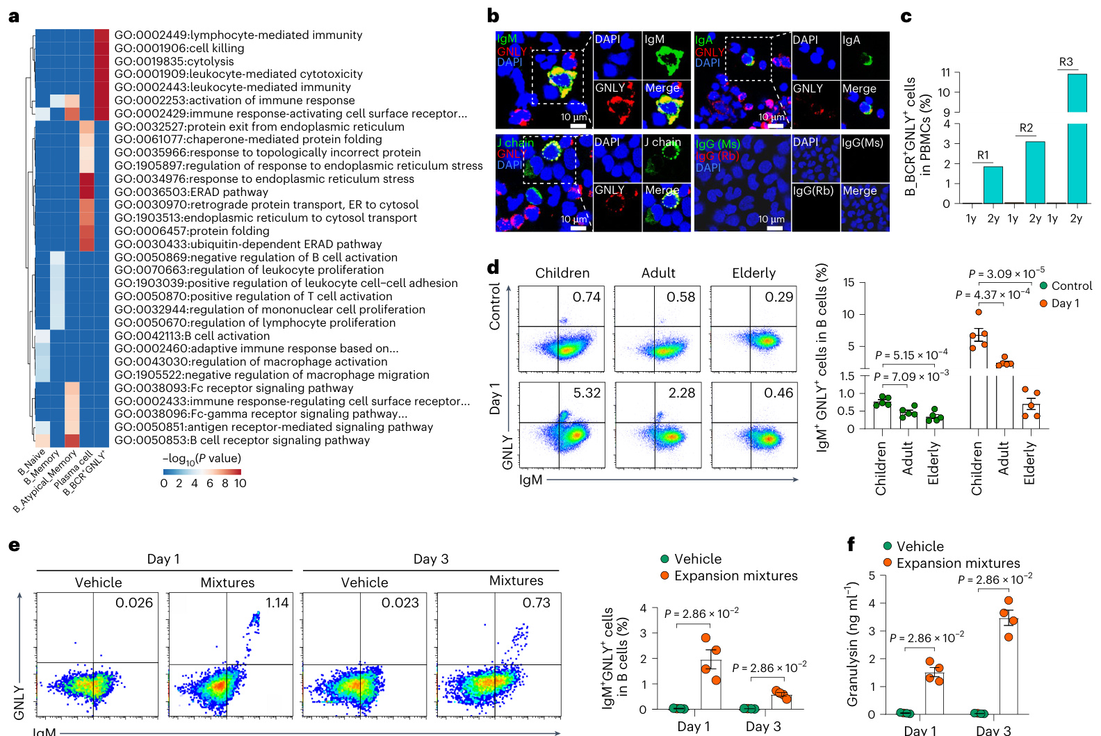 细胞毒性T细胞和B细胞在体外经扩增混合物(包括细胞因子、趋化因子、抗体和佐剂)刺激后被诱导产生[49-51]。因此,我们从健康个体中分离出循环B细胞,并用能激活B细胞的扩增混合物进行刺激。流式细胞分析显示,与对照组相比,暴露于扩增混合物的培养B细胞中$\mathsf{I g M}^{+}\mathsf{G N L Y^{+}}$双阳性B细胞比例显著增加(图6e)。同时,在B细胞培养上清中检测到纳克水平的颗粒溶素(图6f)。此外,为确定这种刺激反应是否具有年龄依赖性,我们分离了三个不同生命阶段(儿童组4-9岁;