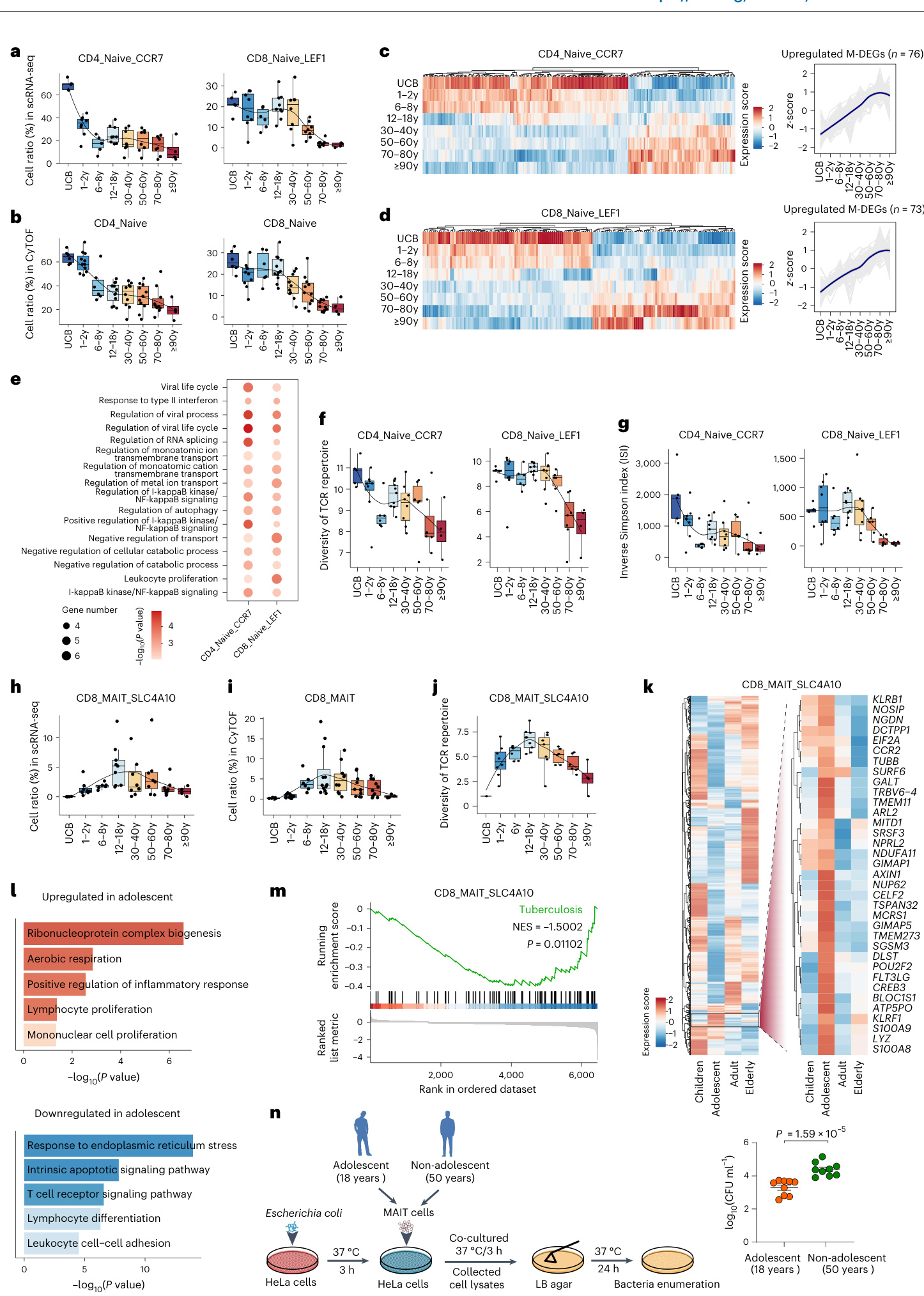 Immune cells with cytotoxic functions inthe peripheral blood of healthy individuals generally include NK and cytotoxic T cells+8. Interestingly, we detected a newly identified and unique B cellsubset(B_BCR+GNLY* cells) that simultaneously expressed B cell markers (such as BCR genes, including immunoglobulin heavy-chain or light-chain coding genes, andJCHAIN) and canonical cytotoxic genes (such as GNLY and NKG7) (Fig. $^{1\mathrm{b},\mathrm{c}}$ and Extended Data Fig. 1b,d). The expression of TCR genes, TRACand KLRF1 were hardly detected inthem,excluding the possibility of these cells being T cells or NK cells(Extended Data Fig.1b,d).Weruled out the possibility of potential technical artefacts (thatis,multiplets) because the number of detected genes and UMIs in B_BCR+GNLY+ cells were lower than those in other subsets(Extended DataFig.1e)and a stringent doublet filtration standard was used to exclude potential eight life stages.k, Heatmap showing the expression of all the DEGs (left) and zoom-in on up regulated genes(right) in CD 8 MA IT S LC 4 A 10 cells in adolescents (12-18 years old).1,Bar plots showing the representative enriched biological processes of up regulated (top) and down regulated (bottom) DEGs in CD8_MAIT_ SLC4A10 cells in adolescents.m,GSEA enrichment plot forgene set'tuberculosis in CD 8 MA IT S LC 4 A 10 cells in the adolescent group compared with other groups. n, Schematic diagram showing the design of MAIT cell's b act eric i dal capability assay(left)and bar plot showing the bacteria load afterMAIT cell coculture.The $P$ value was determined by two-sided unpaired Wilcoxon rank-sum test(right, $n=9$ each). $P$ values ine,Iand m were determined by hyper geometric test. $P<0.05$ was considered statistically significant ine,I,mand n.The black lines indicate LOESS regression ina,b,fand g. CFU, colony forming unit; GSEA, gene set enrichment analysis.