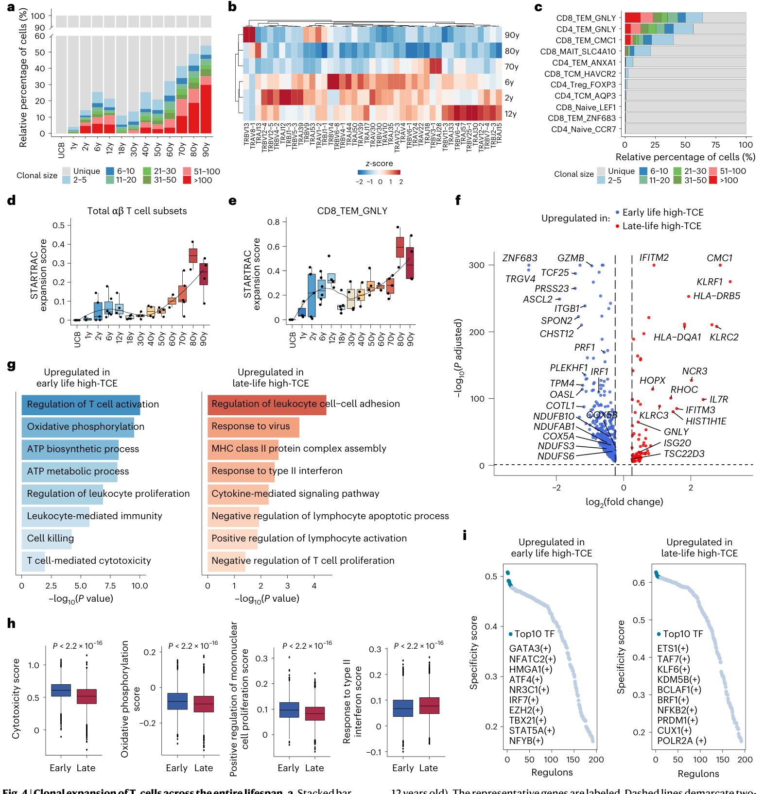 involved in biological processes related to chronic inflammation,which has been linked to aging of solid organs3738. By contrast, the higher expression of cytotoxic genes in high-TCE CD 8 TEM GN LY cells at the developmental stage indicated that these T cells may possess powerful killing functions against infected and cancerous cells.Furthermore, transcription factor analyses indicated that the transcription factor regulon GATA3 displayed the highest activity in the early life high-TCE group (Fig. 4i), whereas the transcription factor regulon ETS1 displayed the highest activity in the late-life high-TCE group (Fig. 4i). GATA3 regulates T cell development, proliferation and maintenance 39.40. ETS1 acts as a regulator of human healthy aging by decreasing ribosomal activity41. Thus, although both groups displayed high clonal expansions of CD 8 TEM GN LY cells, there were distinct functions underlying these expanded T cells between the early life and late-life high-TCE groups.