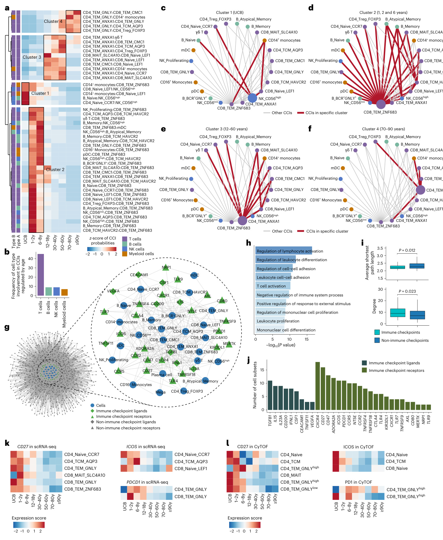Immunological processes involve interactions among various immune cell types to coordinate their behavior during an immune response34,35s We thus further investigated the rewiring of CCIs among peripheral immune cells across the lifespan and found that the CCis displayed different patterns at different stages ofthe lifespan (Fig. 3a-f). Topological characteristics indicated that immune checkpoints have a more critical role in the age-modulated CCl network than non-immune checkpoints (Fig.3g-j). The alterations of immune checkpoints across the whole human lifespan mainly occur in T cells and might have essential roles during human development and aging (Fig. 3k,l and Extended Data Fig. 5a,b). Detailed information about CCls is provided in Supplementary Information Section 1.2.