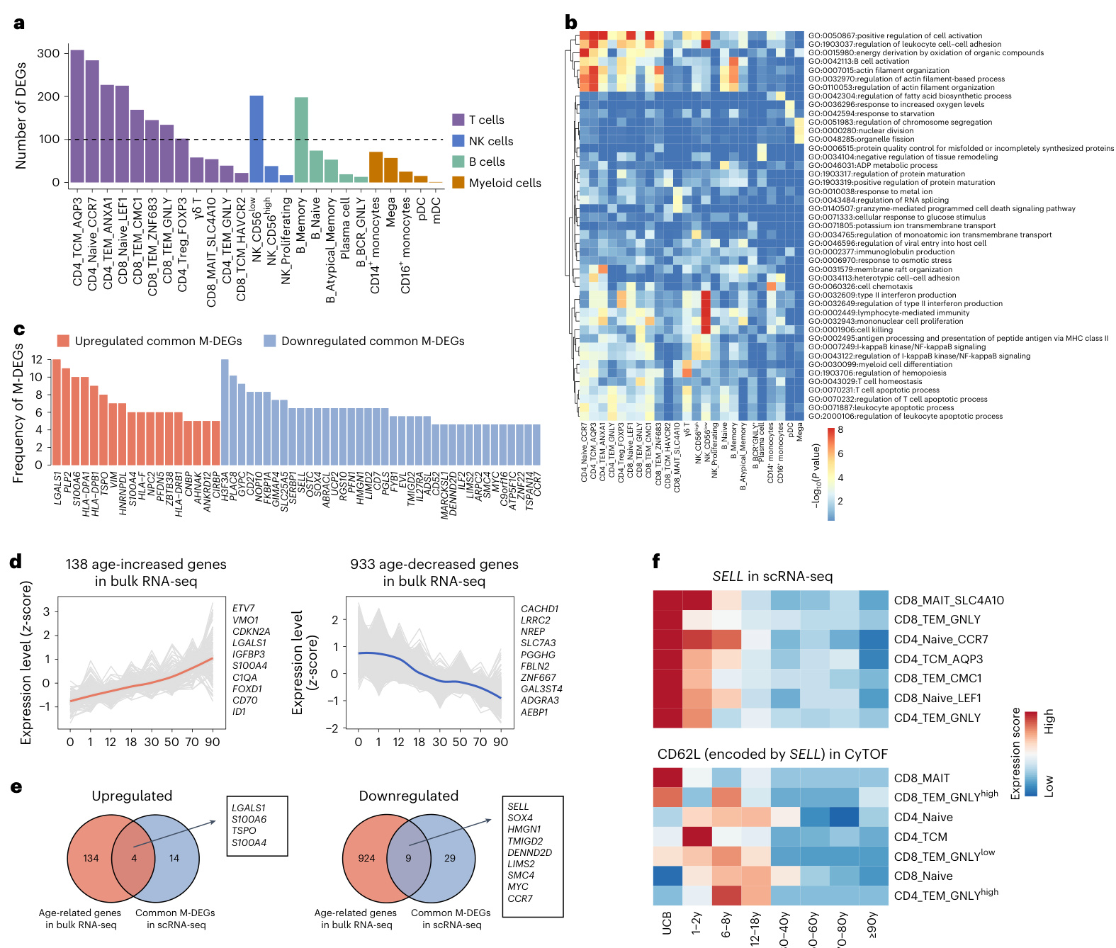 就基因表达z值而言。每条灰线代表一个基因的表达轨迹。e,维恩图展示了在单细胞RNA测序(scRNA-seq)数据中识别的共有M-DEGs与批量RNA测序(bulk RNA-seq)数据中识别的年龄相关基因之间的重叠基因数量。在scRNA-seq定义的56个共有M-DEG基因中,有13个与bulk RNA-seq定义的年龄相关基因存在交集。f,热图显示SELL基因在七个细胞亚群中的scRNAseq表达情况,以及CyTOF检测的相应细胞亚群中CD62L蛋白(由SELL编码)在八个生命阶段的表达水平。