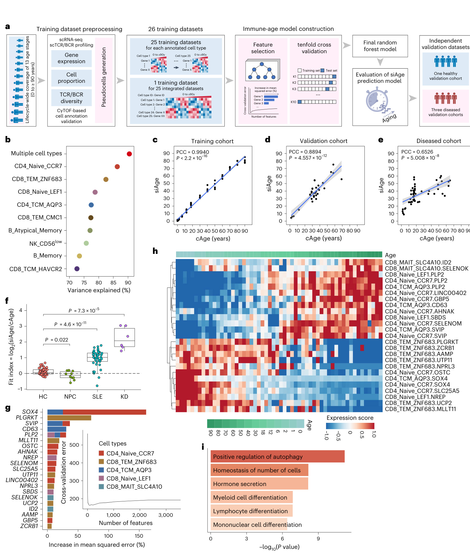 The aging immune system contributes to the morbidity and mortality of the elderly'. One significant obstacle in understanding immune system alterations involves the precise quant if i cation of aging20.52. Our unique lifecycle-wide single-cell data provided an opportunity to construct a single-cell immune age clock model (that is, siAge score) to quantify an individual's immune age and describe their immune status (Fig. 7a). We first built 25 models with data from just one cell subset and another model incorporating all cell subsets. The prediction model integrating all 25 cell subset datasets had the highest predictive score and achieved the best performance (Pearson's correlation coefficient $\left(\mathrm{PCC}\right)=0.9940$ $P<2.2\times10^{-16},$ among the 26 prediction models (Fig. 7b,c and Supplementary Fig. 4a) and was chosen as the final siAge prediction model.