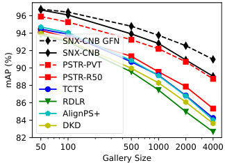 我们在表2中展示了标准基准上最先进方法的对比结果。GFN (Generative Flow Networks) 在所有指标上均带来提升,尤其在PRW数据集上的top-1准确率表现突出:ResNet50骨干网络提升4.6%,ConvNeXt Base骨干网络提升2.9%。我们采用ConvNext Base的最佳模型SeqNeXt+GFN,在PRW数据集上mAP指标较此前最优的PSTR模型提升1.8%,在CUHK-SYSU数据集上提升1.2%。如图4所示,这种优势在CUHK-SYSU更大的图库规模中持续存在。实际上,随着图库规模增大,GFN的分数加权机制会发挥更大作用——这与预期一致,因为相较于在单一场景中区分人物,降低上下文不相关场景权重的策略在对比场景增多时会产生更显著的影响。