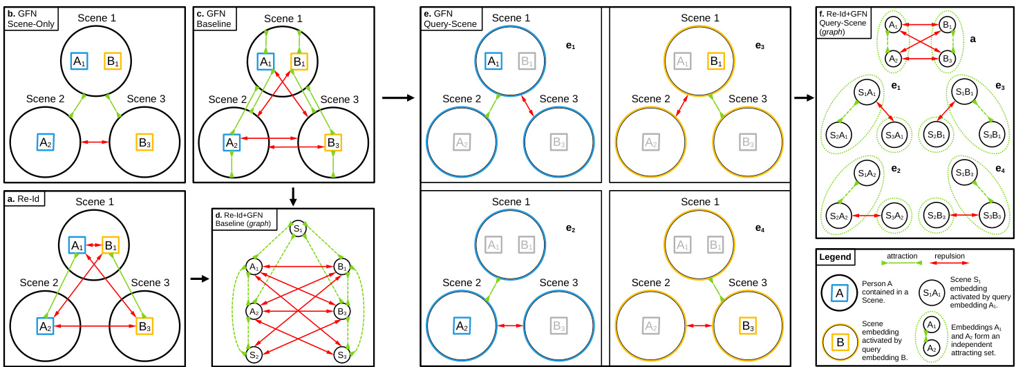 图 3: 重识别(re-id)与图因子网络(GFN)优化目标的视觉表示。a) b) c) e)中的圆圈代表包含一个或多个不同人员身份(标记为A和B)的场景图像,展示了包含两个独特人员身份的三种场景系统。绿色连接线表示吸引力(即两个嵌入向量被目标函数拉近),红色连接线表示排斥力(即两个嵌入向量被目标函数推远)。a)展示了标准重识别损失目标;b)展示了仅场景的GFN目标;c)展示了基线GFN目标;e)展示了查询-场景联合GFN目标。d)以图形式展示了基线GFN目标与重识别目标的组合;f)以图形式展示了查询-场景联合GFN目标与重识别目标的组合,其中绿色椭圆包围了每个多部件独立集。