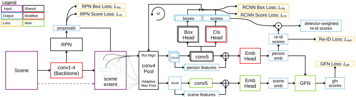 图 2: 采用GFN增强的SeqNeXt人员搜索模型架构。从SeqNet修改的模块标为红色,与GFN相关的新模块标为绿色。该模型遵循标准Faster R-CNN范式,使用conv4的主干特征通过RPN生成候选框。对RPN候选框进行conv4特征池化后,经conv5头部生成优化候选框。该过程在优化候选框上重复以生成最终检测框。conv4特征还以相同方式生成人员嵌入和场景嵌入:人员框或场景通过池化块后,经复制的conv5头部处理,最终将conv4和conv5特征拼接并通过嵌入(Emb)头部。池化块中,人员及候选框特征采用RoI Align [16],场景特征采用自适应最大池化。GFN分数通过同场景或跨场景的人员与场景嵌入生成。人员重识别分数与第二阶段R-CNN的输出分数结合,形成检测器加权分数。