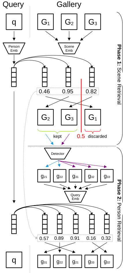 focused on reducing the cost of one or more of these steps. We propose the second and third steps can be avoided altogether for some subset of gallery scenes by splitting the retrieval process into two phases: scene retrieval, followed by typical person retrieval. This two-phase process is visualized in Figure 1. We call the module implementing scene retrieval the Gallery Filter Network (GFN), since its function is to filter scenes from the gallery.