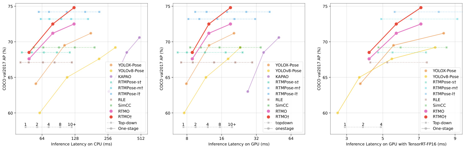 Figure 3. Comparison of RTMO with other real-time multi-person pose estimators. The latency for top-down methods varies depending on the number of instances in the image, as indicated by numerical values in the figures. All models are evaluated without test-time augmentation. $^\dagger$ indicates that the model was trained using additional data beyond the COCO train2017 dataset.
