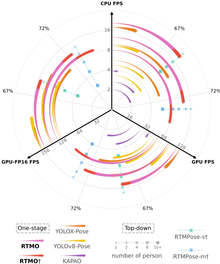 图 1: 不同推理后端和设备上实时姿态估计方法的效率与效果对比。径向轴表示以每秒帧数 (FPS) 衡量的推理速度。外圈圆周轴显示在 COCO val2017 数据集上的平均精度 (AP)。标有 $^\dagger$ 的模型使用了超出 COCO train2017 的额外数据进行训练。