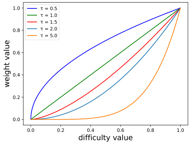 图 2: 展示了参数 $\tau$ 值的变化如何影响不同难度类别权重值的调整。其效果与焦点损失 [14] 中的聚焦参数 $\gamma$ 几乎相似。我们提出方法的性能随 $\tau$ 值变化而显著波动,且最佳 $\tau$ 值因数据集而异。遗憾的是,寻找最佳 $\tau$ 值的唯一方法是通过试错。为避免这种情况,我们提出了一种动态更新 $\tau$ 值的方法。对于动态更新 $\tau$,训练时间 $t$ 后的 $\tau$ 值计算公式为