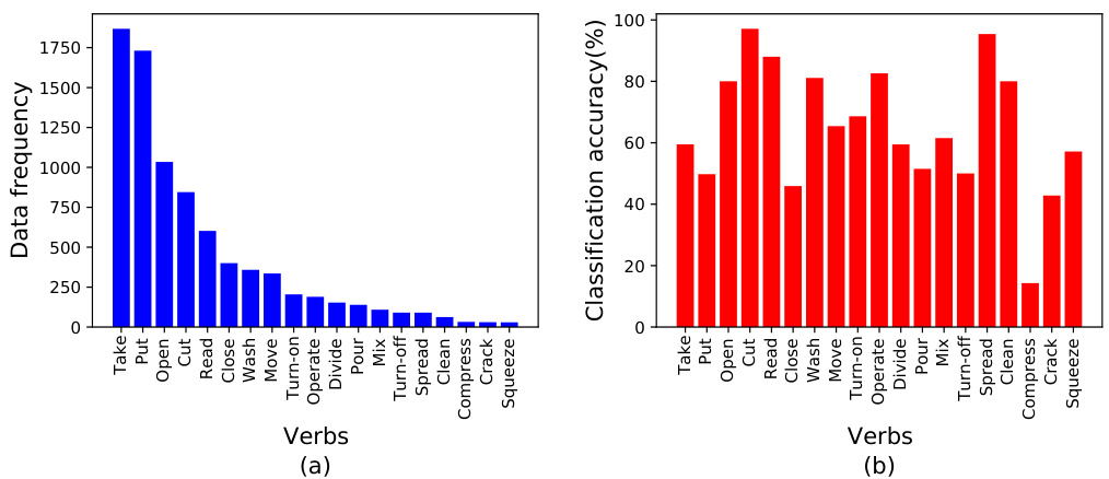 Fig. 1. (a) Class-imbalanced data distribution of EGTEA dataset. (b) Class-wise classification accuracies of a 3D-ResNeXt101 trained on the imbalanced EGTEA dataset using unweighted softmax cross-entropy loss function. It is interesting to notice that even though classes like ‘Clean’ and ‘Spread’ have very small number of data samples, the classifier finds it relatively easier to learn such classes compared to certain densely populated classes such as ‘Take’ and ‘Put’. Therefore it is not obvious to assume that the sparsely populated classes will always be the most weakly represented.